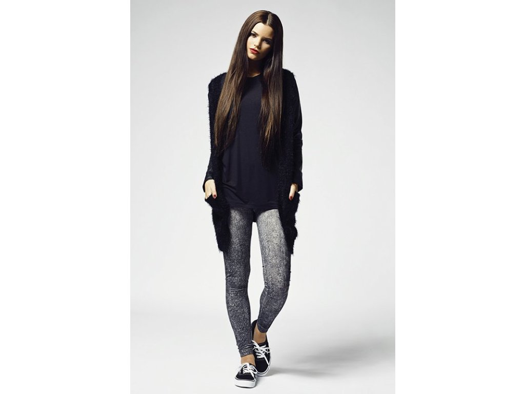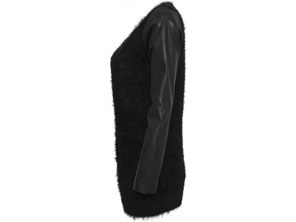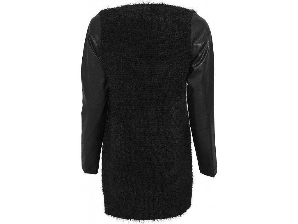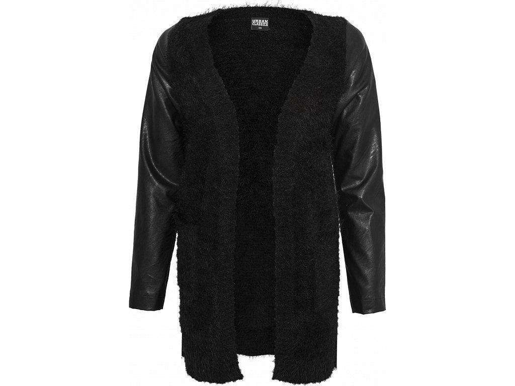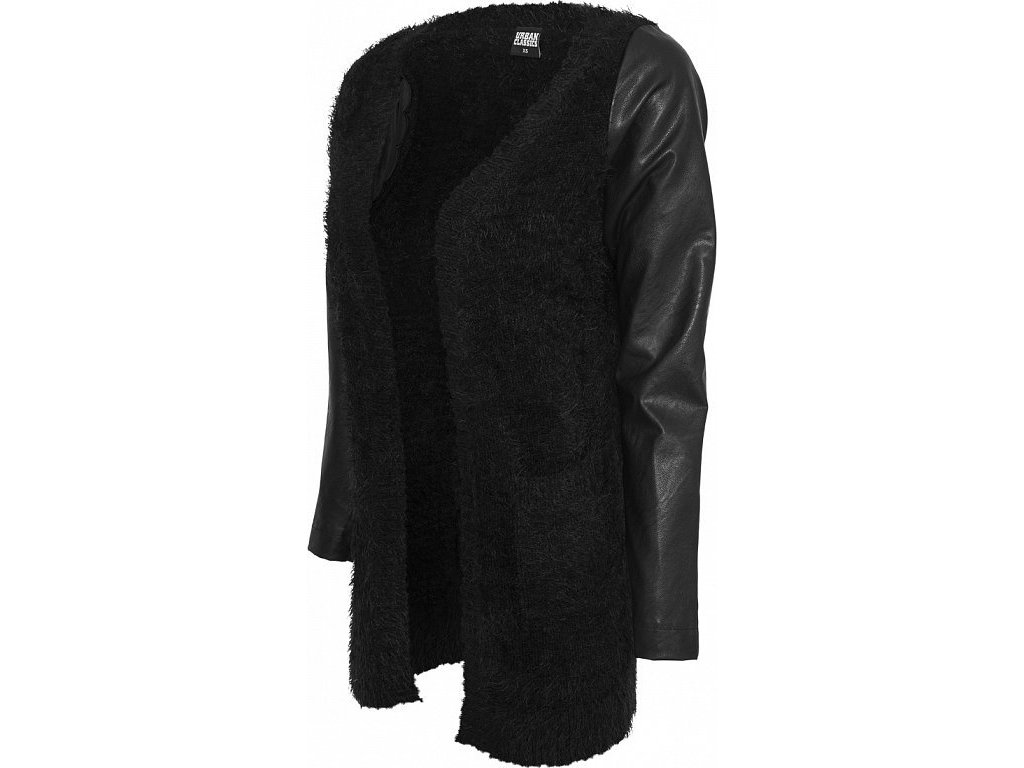 Chlupatý kardigan nad kolena s koženkovými rukávy (Velikost L, Barva černá - černá)