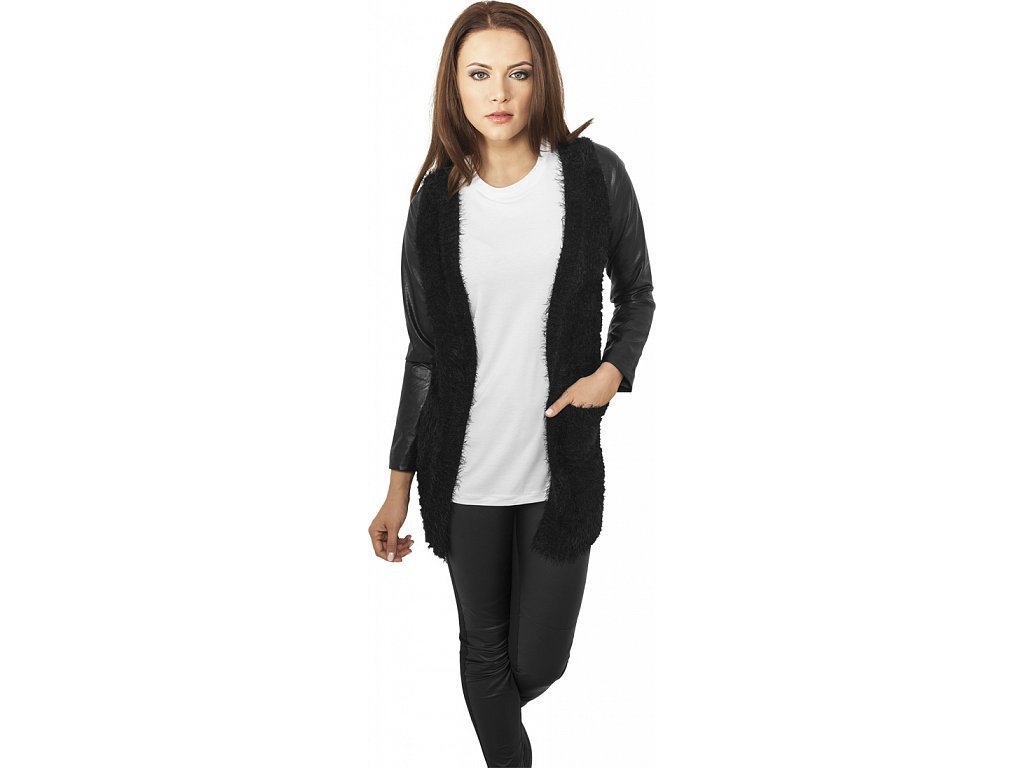 Chlupatý kardigan nad kolena s koženkovými rukávy