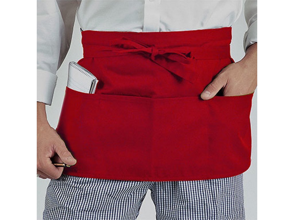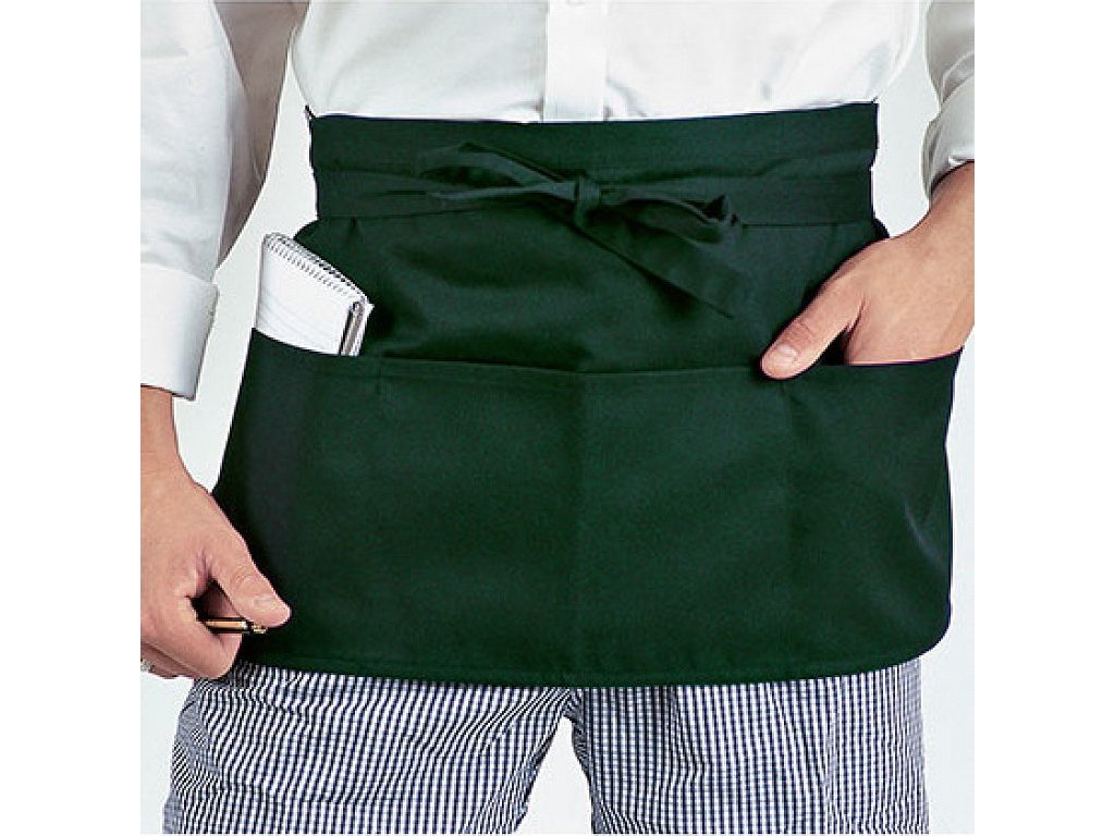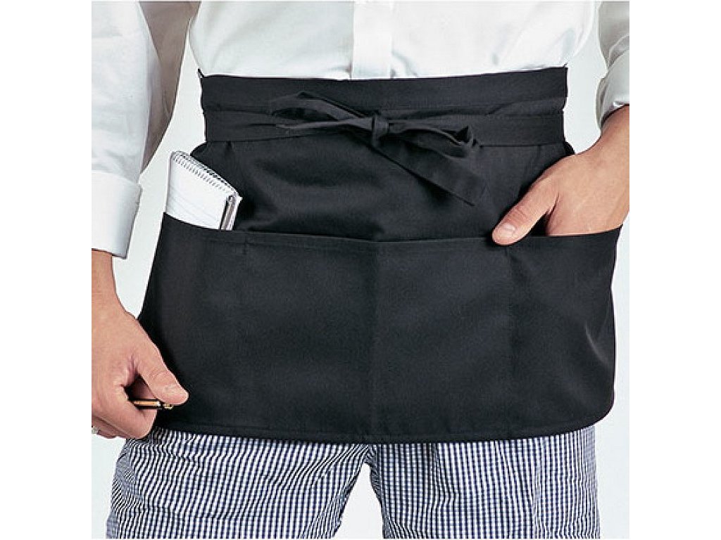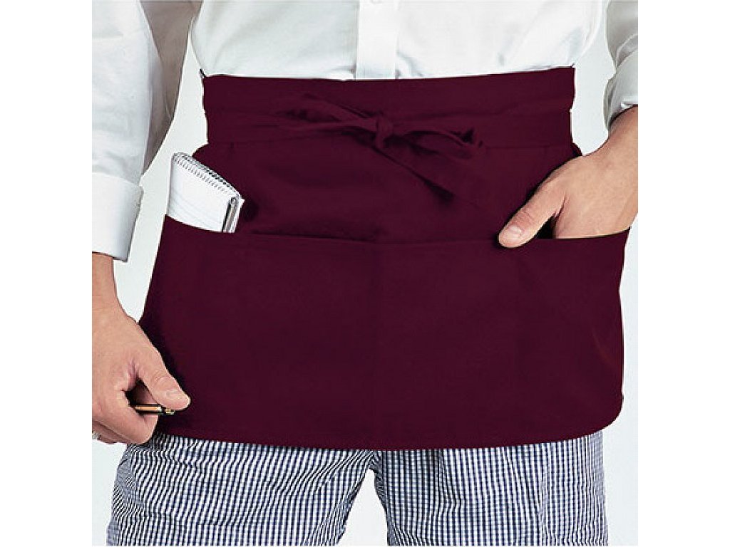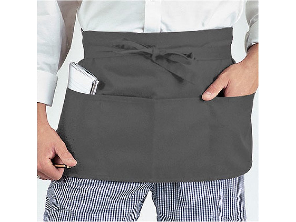 Zástěra je vybavena třemi hlubokými kapsami, které umožňují snadné uložení drobných předmětů, jako jsou bloky na objednávky nebo psací potřeby. Jednobarevný design dodává zástěře profesionální vzhled, který se hodí do jakéhokoliv prostředí.