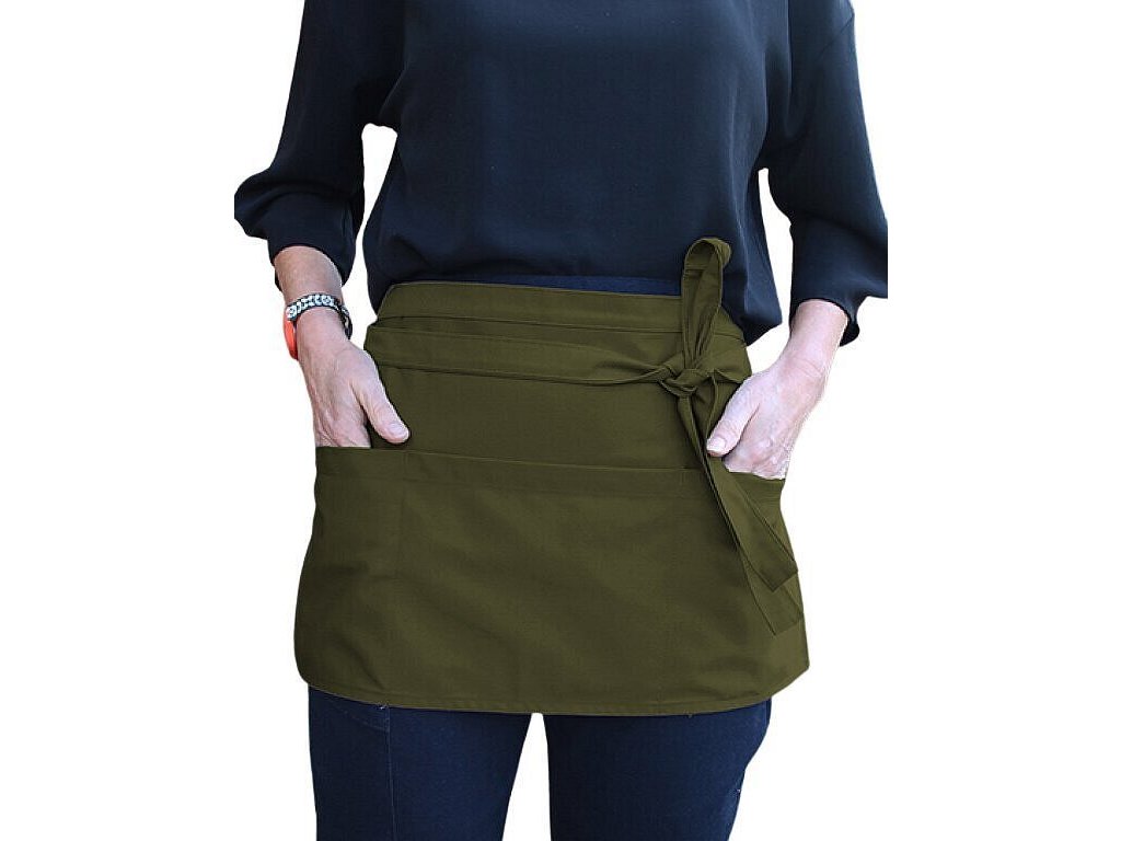 Krátký střih zástěry o rozměrech 58 x 30 cm je navržen tak, aby poskytoval volnost pohybu a zároveň chránil oblečení před nečistotami. Díky absenci laclu je zástěra lehká a snadno se obléká i svléká.